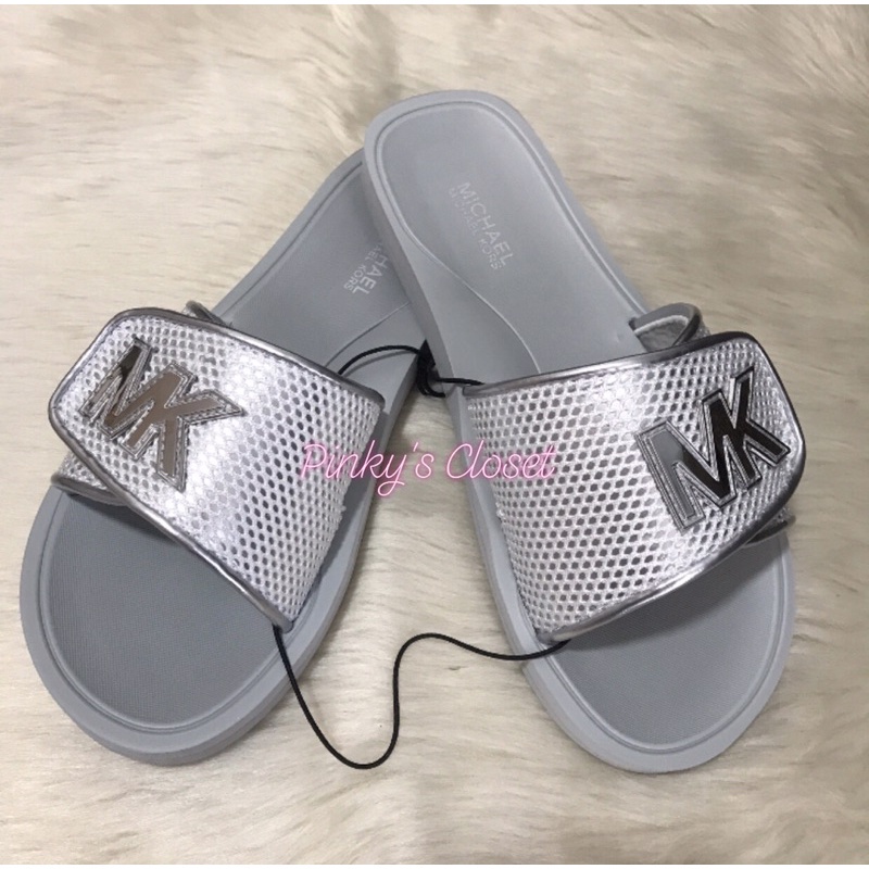 MICHAEL KORS SANDALS Beach Palmer Slide LG Net Mesh Silver White Very well made.