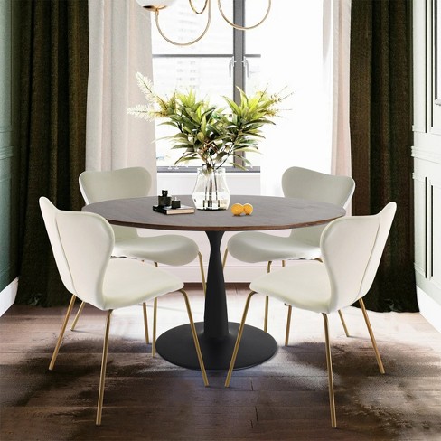 Harold Flavia 5 Piece Walnut Foil Round Top Pedestal Dining Table Set with 4 Beige Upholstered Chairs The Pop Maison Very well made.