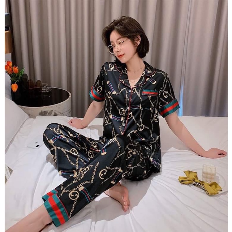Short Sleeve Print Women Pajama Set Ice Silk Loose Soft Sleepwear Very well made.