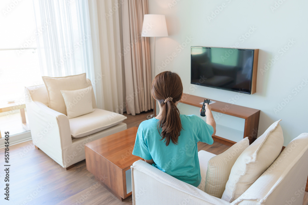 Woman relaxing on the couch Girl using remote control and Very well made.